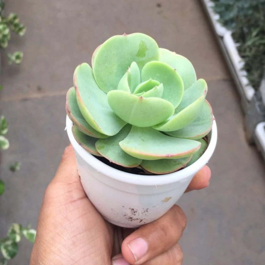 Echeveria Green Spoon is a dainty succulent that has soft round leaves which develop a reddish border when exposed to strong sunlight.