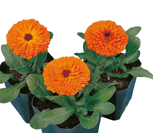 Calypso Calendula, commonly known as pot marigold, produces large, brightly colored flowers with black centers.